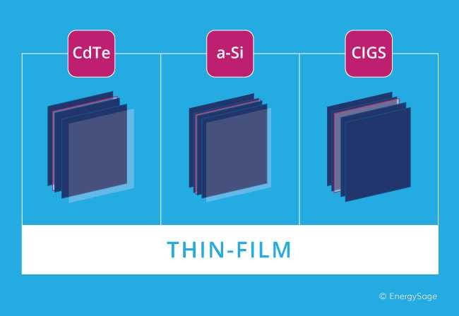 Tidak seperti panel surya monokristalin dan polikristalin, panel film tipis dibuat dari berbagai bahan. Jenis panel surya film tipis yang paling umum dibuat dari cadmium telluride (CdTe). Untuk membuat panel film tipis jenis ini, pabrikan menempatkan lapisan CdTe di antara lapisan konduktor transparan yang membantu menangkap sinar matahari. Jenis teknologi film tipis ini juga memiliki lapisan kaca di bagian atasnya untuk perlindungan.